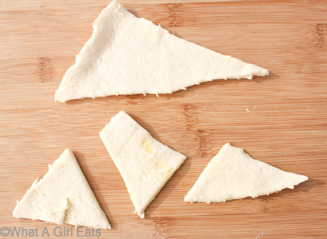 Stretch each piece out a bit. Put a teaspoon or so of the bleu cheese dip in the center of each triangle.